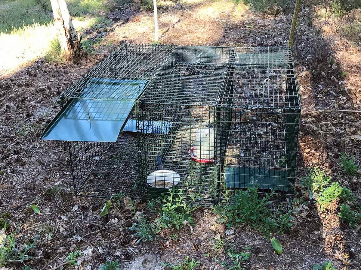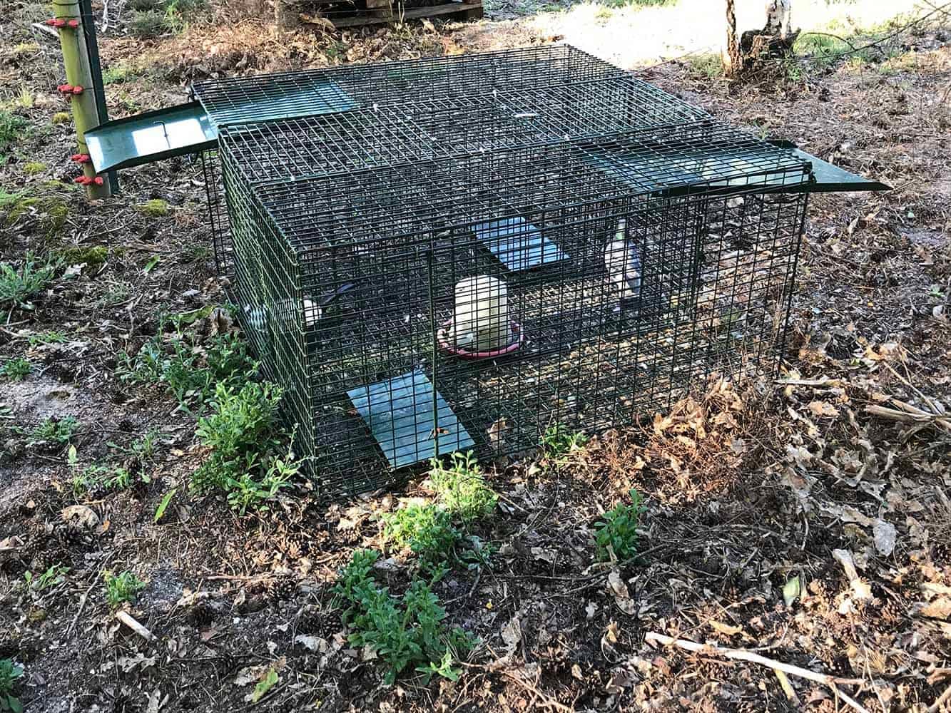 Partie centrale pour y mettre un appât vivant et une entrée de chaque côté pour attraper le renard.