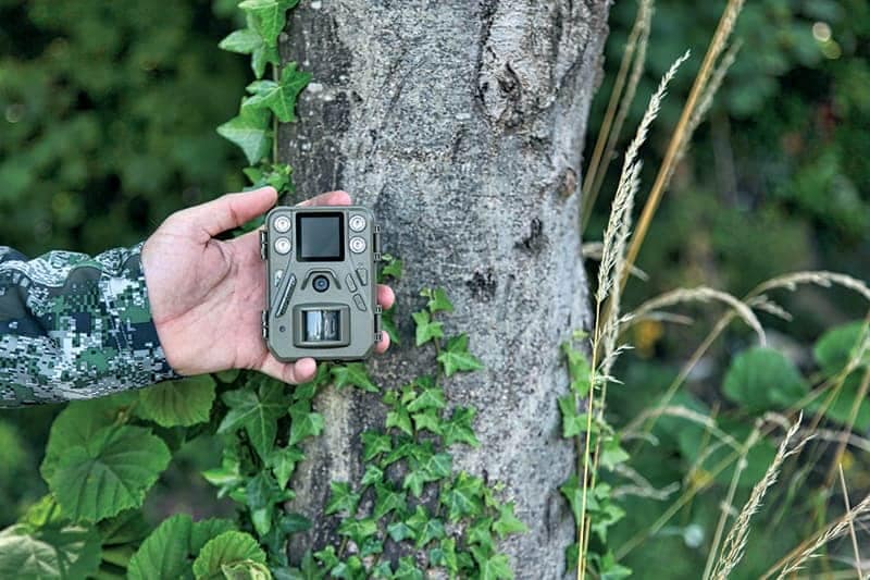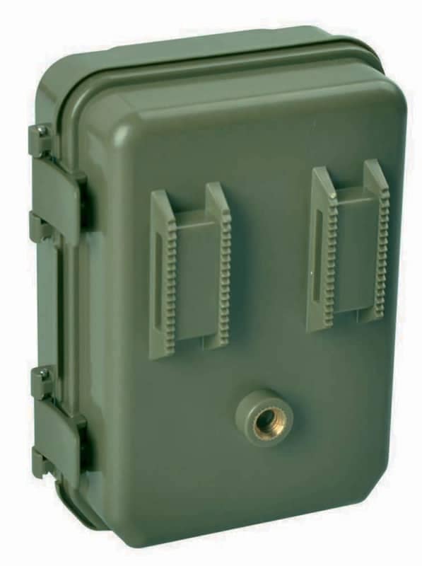 Caméra de surveillance avec 4 LEDS à infrarouges noires. Déclenchement auto- matique par détecteur de mouvement àhaute sensibilité. (portée jusqu’à 30 m).