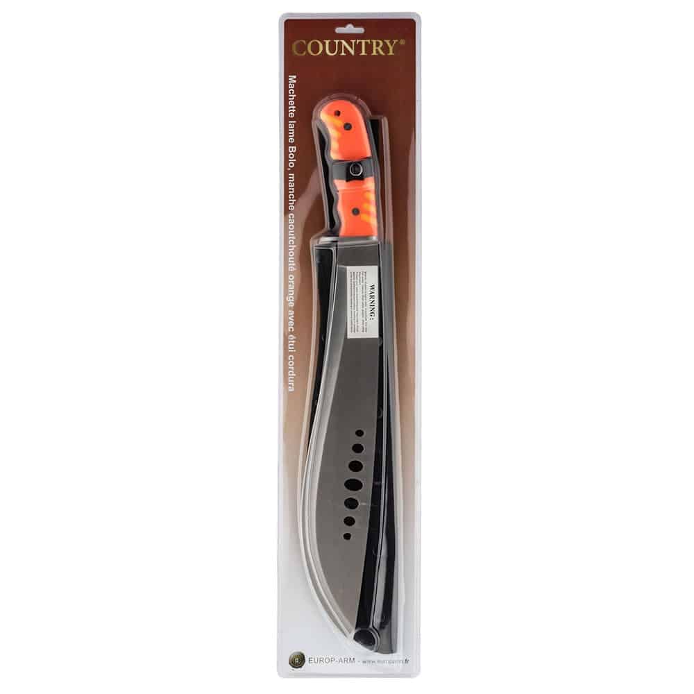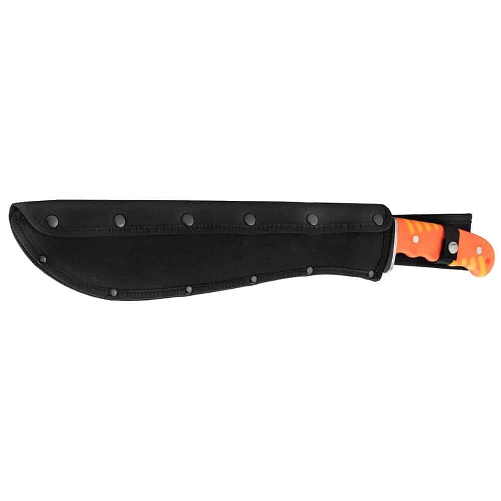 Machette avec lame ajourée forme bolo et manche orange caoutchouté.