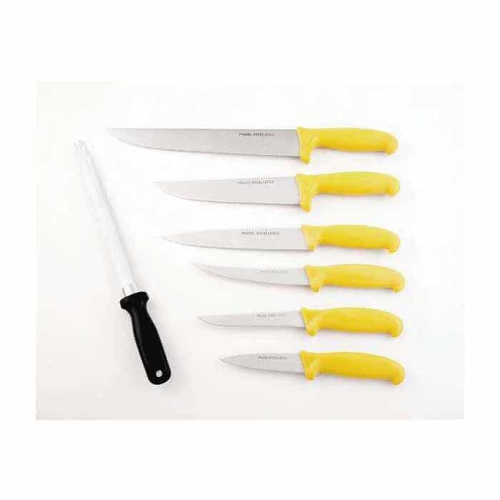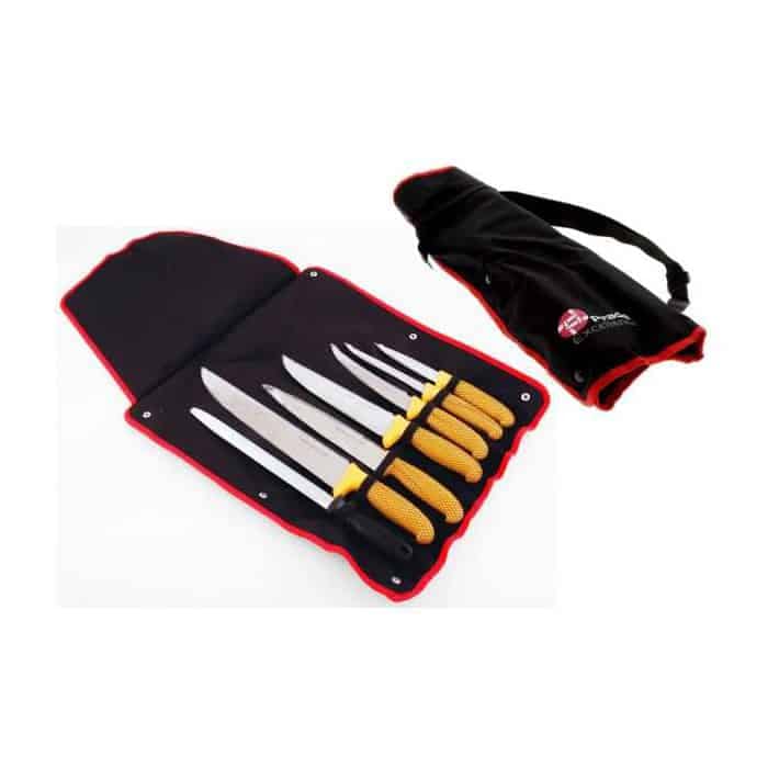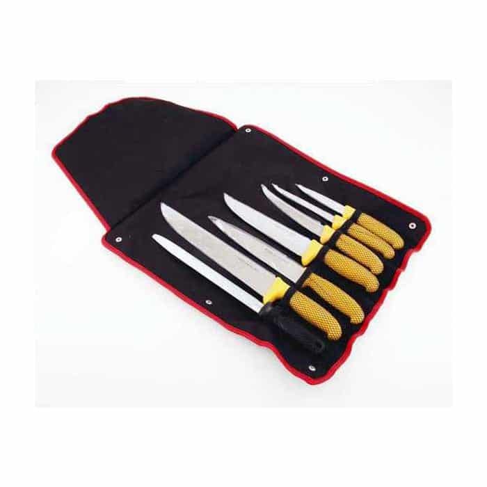 Sac de coutellerie comprenant : 6 couteaux boucher (couteau de cuisine lame 10 cm / couteau boucher lame 27 cm / couteau chef lame 21 cm / couteau à désosser lame 13 cm / couteau desosser flexible lame 15 cm / couteau saigner lame 21 cm + 1 fusil à aiguiser 25 cm). Lame en acier inoxydable. Manches jaunes. Le sac est convertible en tablier.
